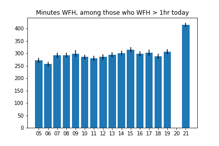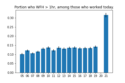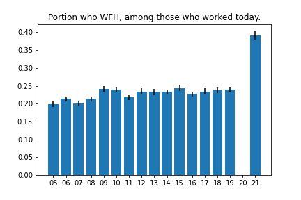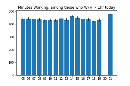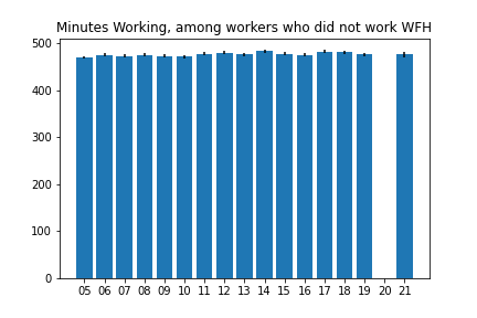 I counted an activity as “Working from Home” if if it was coded as “Working” (codes 0501xx) and if the location for that activity was “Respondent’s home or yard” (code 101).