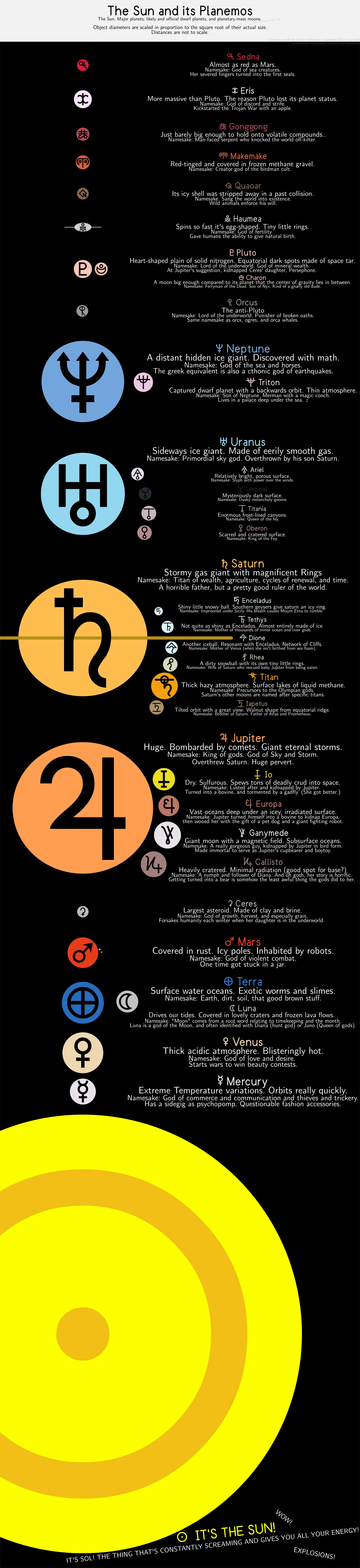 The above graphic depicts the planetary-mass objects (planemos) of the solar system. Each celestial object is depicted as a simple solid color circle overlayed with an astronomical symbol, and accompanied by a brief description of both the object and its namesake.